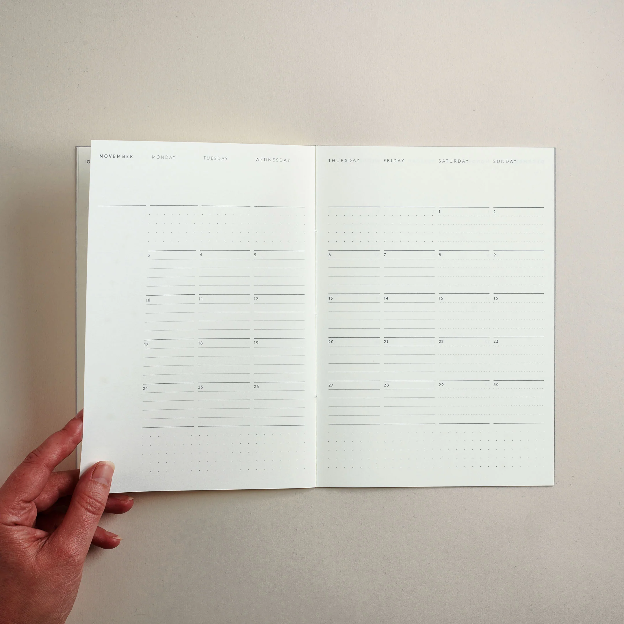 The monthly-planner format emerged out of conversations with our diary customers, who asked us for a 'zoomed-out' month view, so they could visualise the full month in one go. We kept the principles and grid of our minimal week-view layout, and created this complimentary planner which works equally well as a standalone planner (slim enough to slot in with your notebook) or paired with the Diary as part of your own modular system.