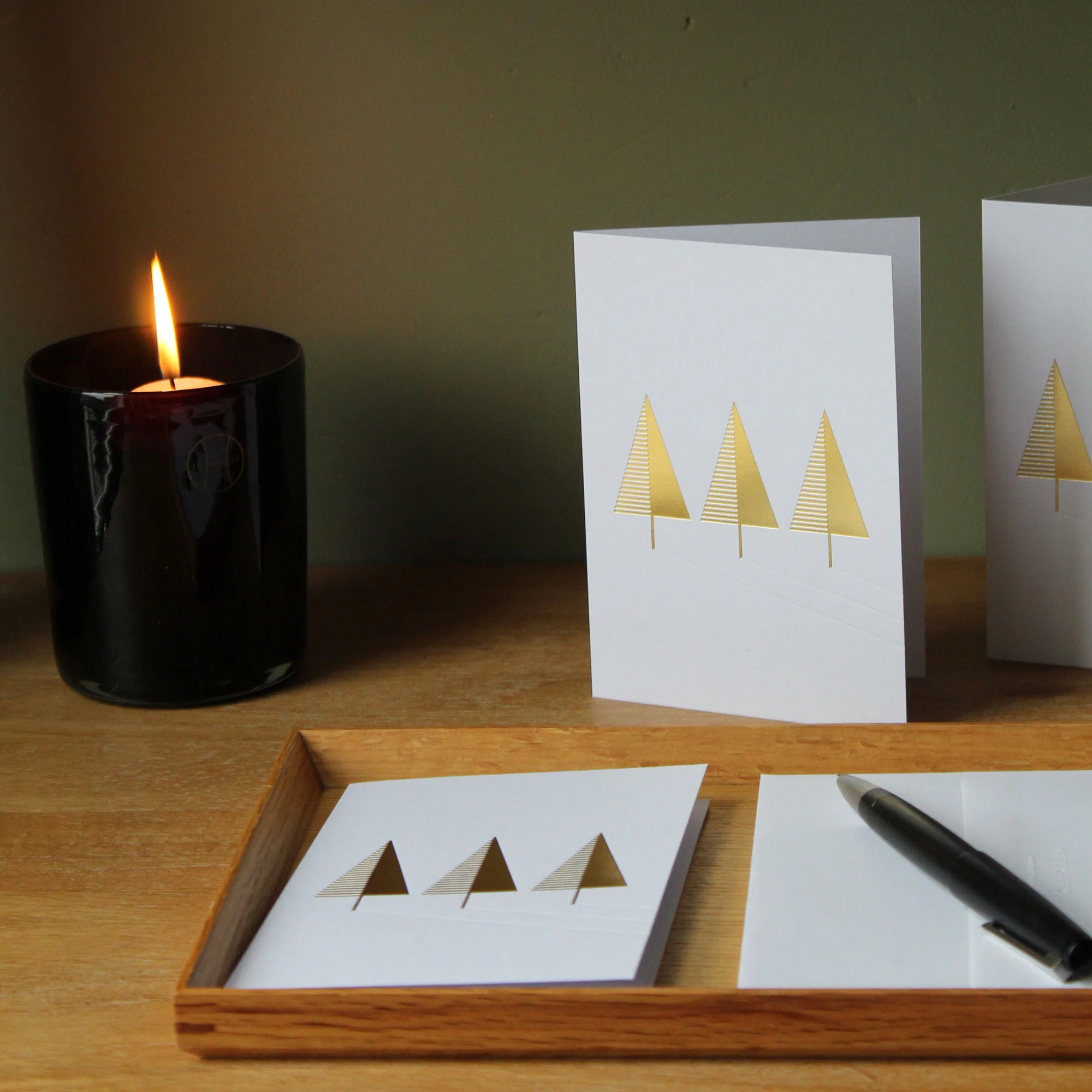 Our festive tree card features a row of golden trees and blind debossed shadows. Printed in Scotland on a traditional Heidelberg Press, onto high quality frost-white 270gsm card, which is made in Cumbria. Matching envelopes, made from the same paper in 120gsm, hand-assembled in Hull.