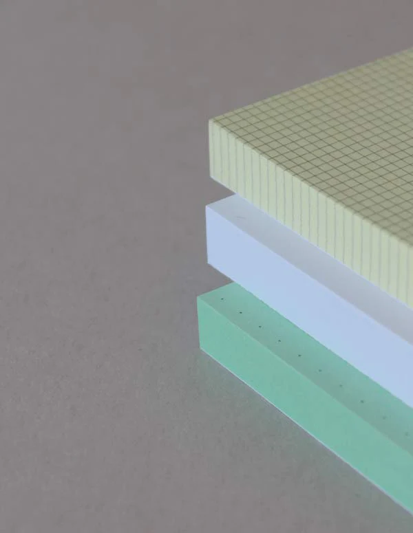 Set of 3 Note Block pads, based on the much loved post-its. Taking a time-honoured classic and adding a Mark+Fold touch, the set includes Mint Green with dot grid, Yellow with square grid, White with satisfying tick boxes. Designed as part of a Modular System â our Sticky Notes fit perfectly into the âgridâ space on the Mark+Fold Diary and Wall Planner, and into the âlistâ column of the Planner Pad.