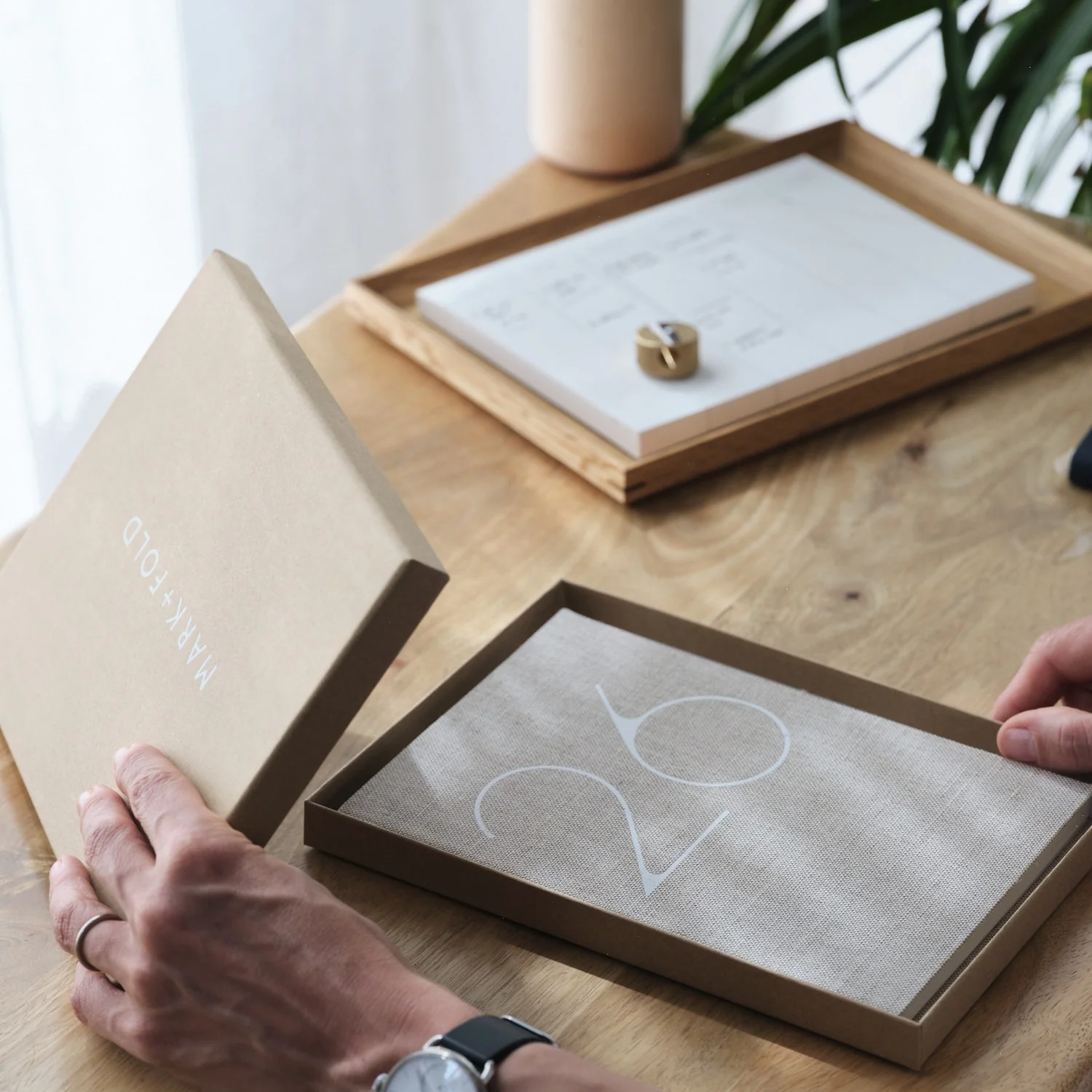 The Ultimate Gift Set is our selection of the most covetable items in the Mark+Fold range. It's the no holds barred shopping cart that we'd all like to treat ourselves to. Everything is included, from our bestselling layflat notebook, week-view diary and week planner pad, plus a selection of shiny brass accessories, pencils, erasers and more.